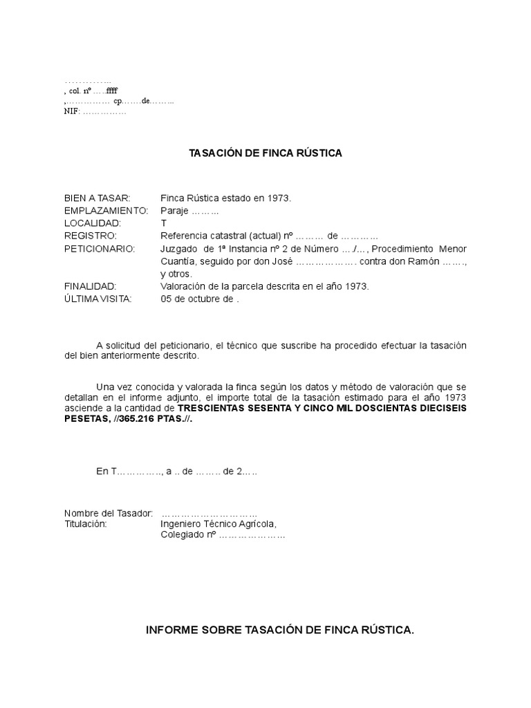 El primero y esencial es precisamente el de finca rstica. Este informe de tasacin se realiza y se somete considerando las siguientes excepciones jurisdiccionales. Un modelo de informe de tasacin de finca rstica tiene los siguientes apartados.