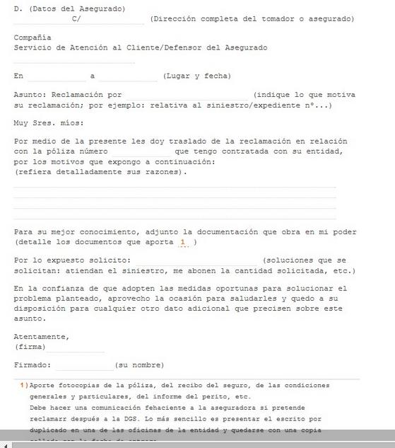 Modelo de carta de reclamacion a compaia de seguros. Ofrecemos en el presente escrito unas claves breves sobre el escrito de designa para reclamaciones a seguro. Estos escritos pueden presentarse por duplicado en la oficina ms cercana solicitando que sean firmados o sellados.