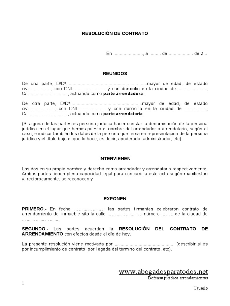 Arrendamiento sin prrrogas aos y el Arrendatario ha desistido con anterioridad al transcurso de dicho plazo o durante el transcurso de una de las prrrogas legales. En este post te dejo un modelo de resolucin de contrato de arrendamiento de oficina con o sin reconocimiento de deuda en formato editable word gratis. Yo mismo lo he elaborado y te invito a que lo utilices.